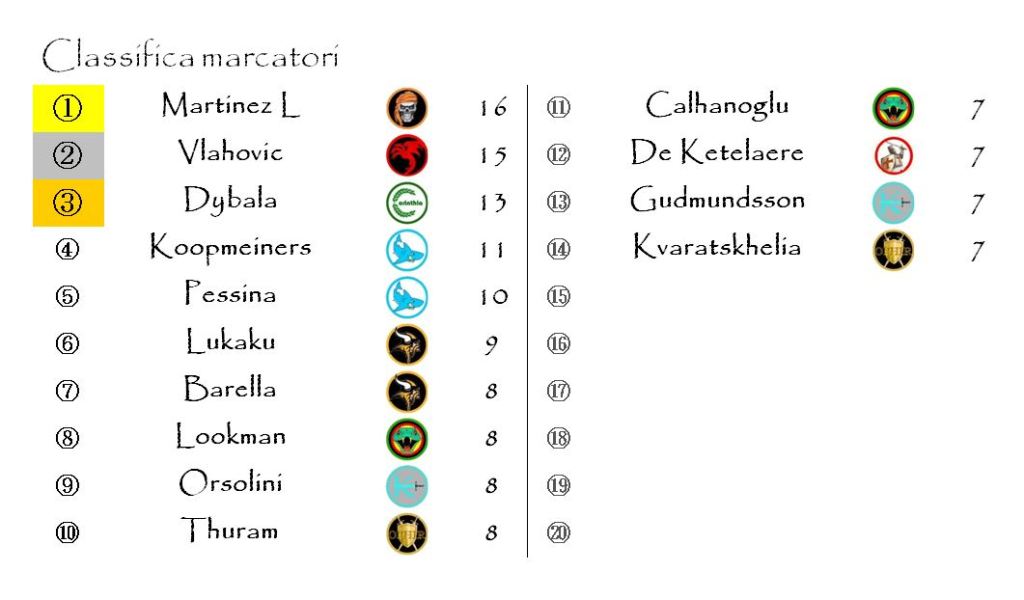 Il turnover che ha coinvolto Lautaro Martinez e la squalifica che ha fermato Dusan Vlahovic hanno fatto sì che i due leaders della corsa al Pugnale d’Oro di Hyboria non potessero muovere la classifica.