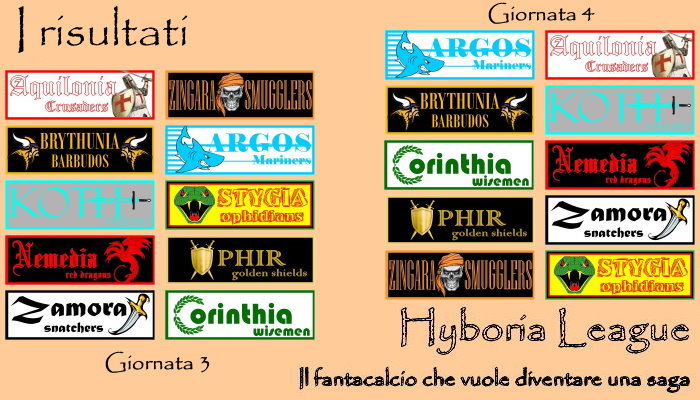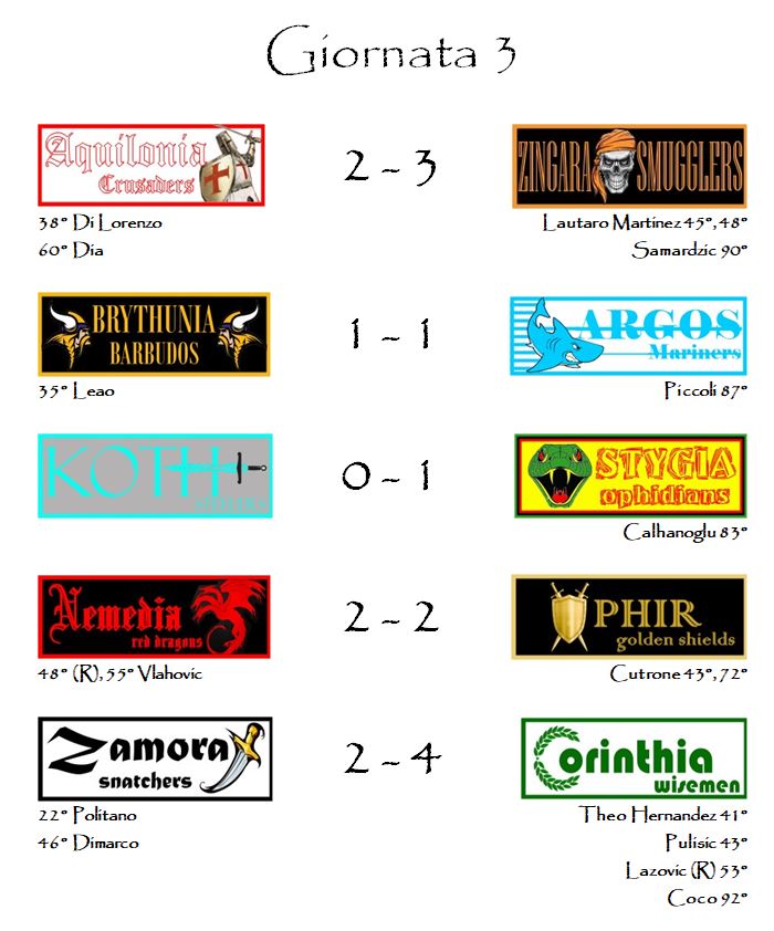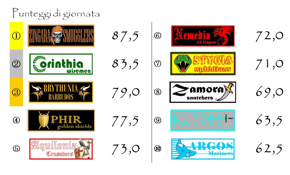 Il programma prevede anche Aquilonia–Ophir, partita molto interessante tra due squadre di cui non riusciamo a percepire ancora il reale valore, il testa-coda tra la capolista Stygia ed il fanalino di coda Argos e la sfida tra le due franchigie gemelle di Koth e Nemedia.