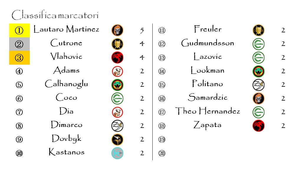 Le altre sei marcature extra di questo doppio turno sono andate a Sebastiano Luperto e Rafael Leao dei Brythunia Barbudos, a Giovanni Di Lorenzo degli Aquilonia Crusaders, a Federico Dimarco degli Zamora Snatchers e ad Hakan Calhanoglu degli Stygia Ophidians. Il turco se n’è aggiudicate addirittura due.