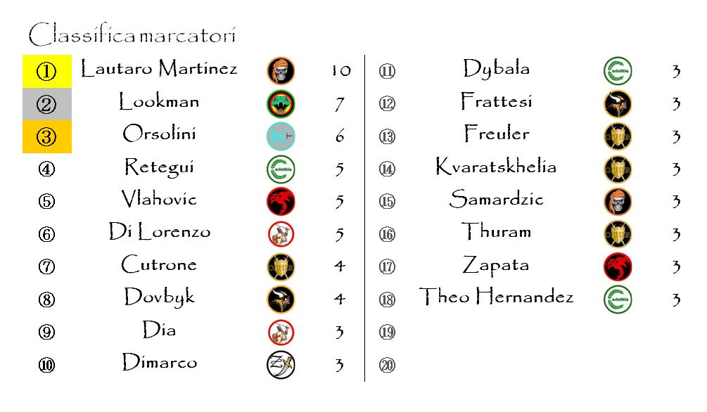 Sono state ben sette le marcature extra che abbiamo potuto attribuire in questo turno. Oltre a quella già citata di Lautaro Martinez, le altre sono andate a Niccolò Barella, Riccardo Orsolini, Federico Dimarco, Raoul Bellanova, Theo Hernandez ed Isak Hien.