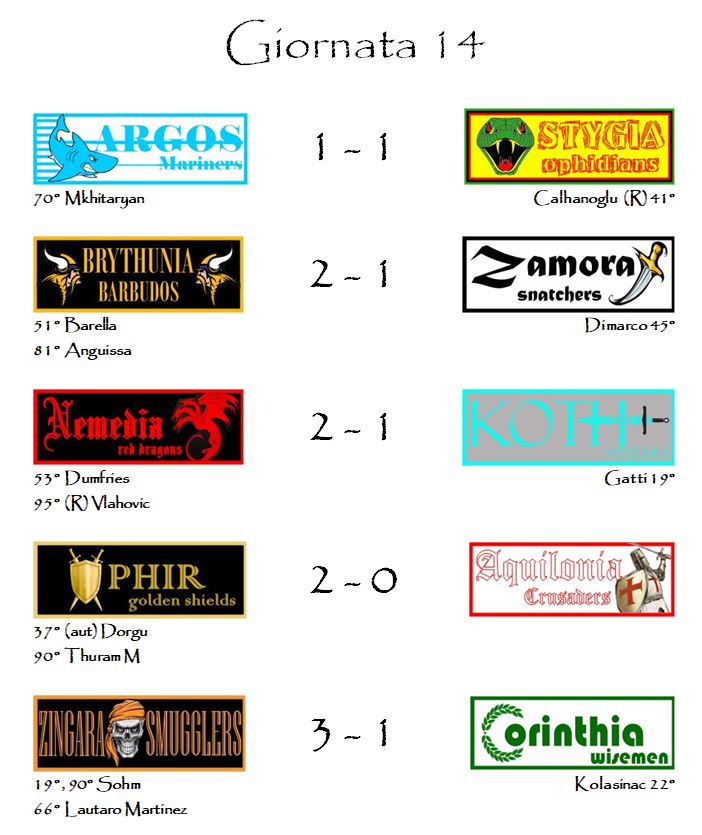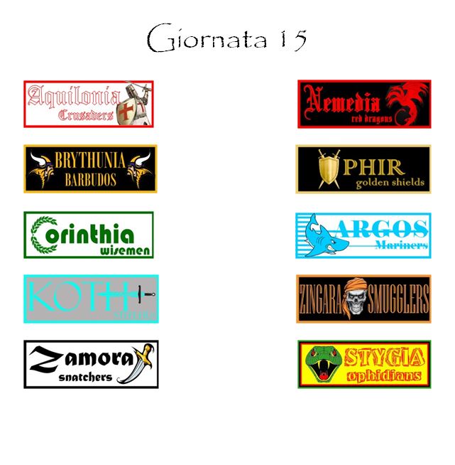 Il quadro degli incontri sarà completato dal trentesimo derby d’Hyboria della storia del nostro fantacalcio. L’epico scontro tra le squadre più prestigiose della nostra Lega andrà in scena al Conan Memorial di Tarantia. Per Aquilonia è soprattutto una questione d’onore. Vincere le consentirebbe di salvare parzialmente una stagione che sta andando a rotoli. Per la Nemedia, che sarà priva di Alessandro Buongiorno, i tre punti sono indispensabili per continuare l’inseguimento al tandem di testa.