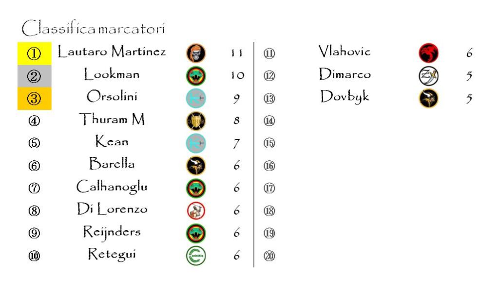 Due sono state invece le marcature extra che abbiamo potuto attribuire: sono andate a Niccolò Barella e Giovanni Di Lorenzo, capitani di Brythunia ed Aquilonia.