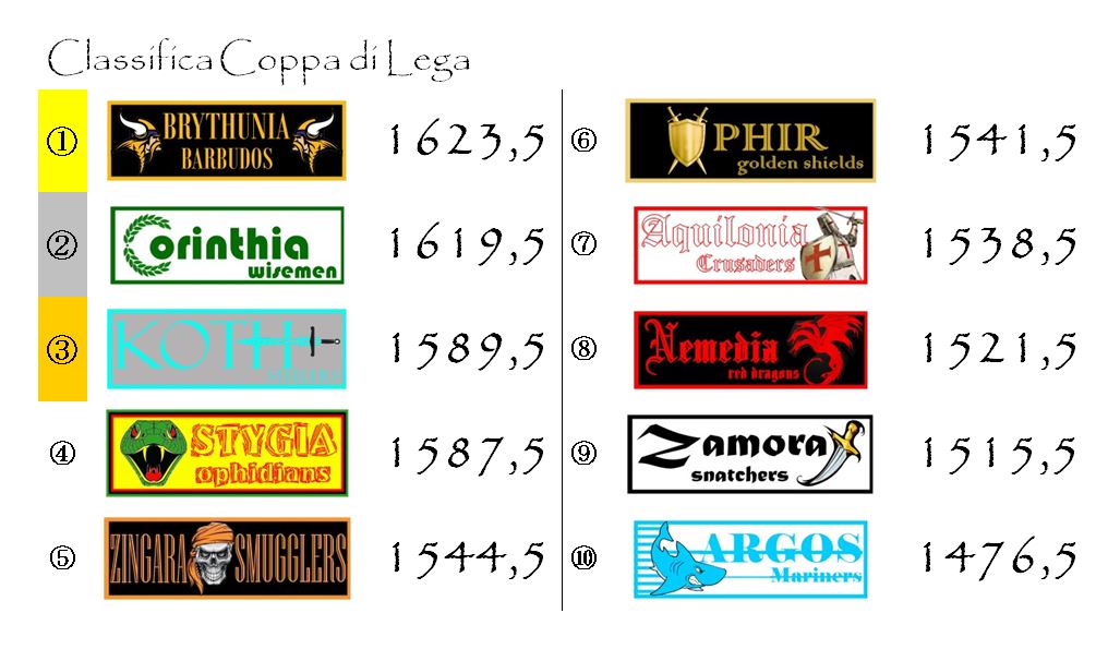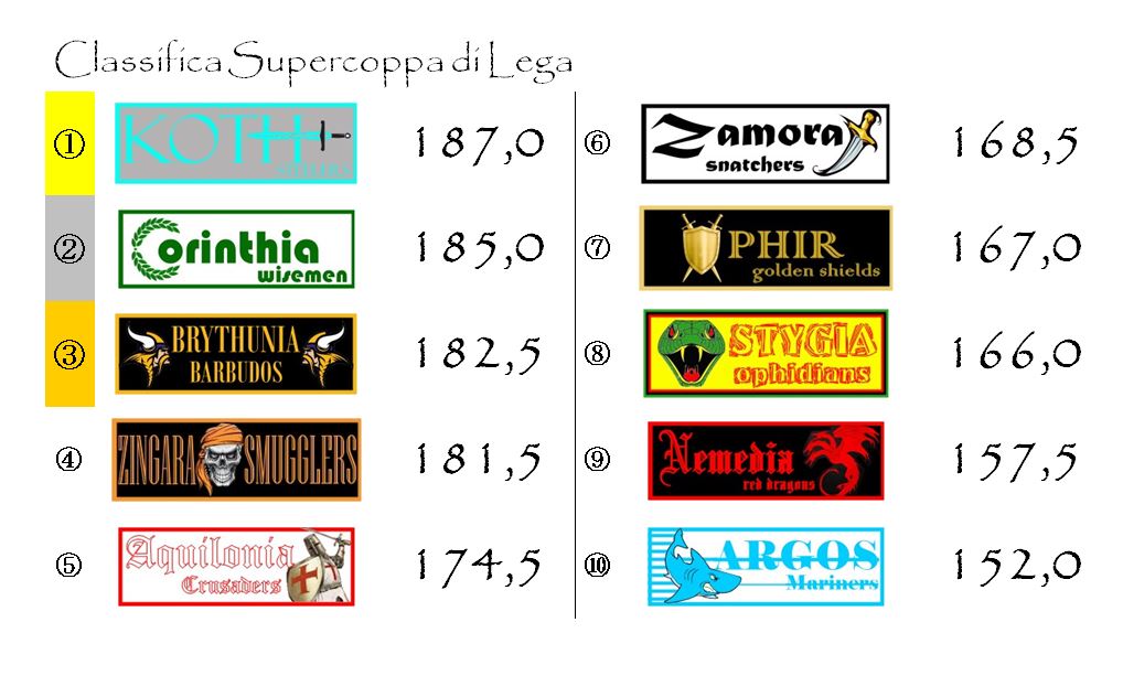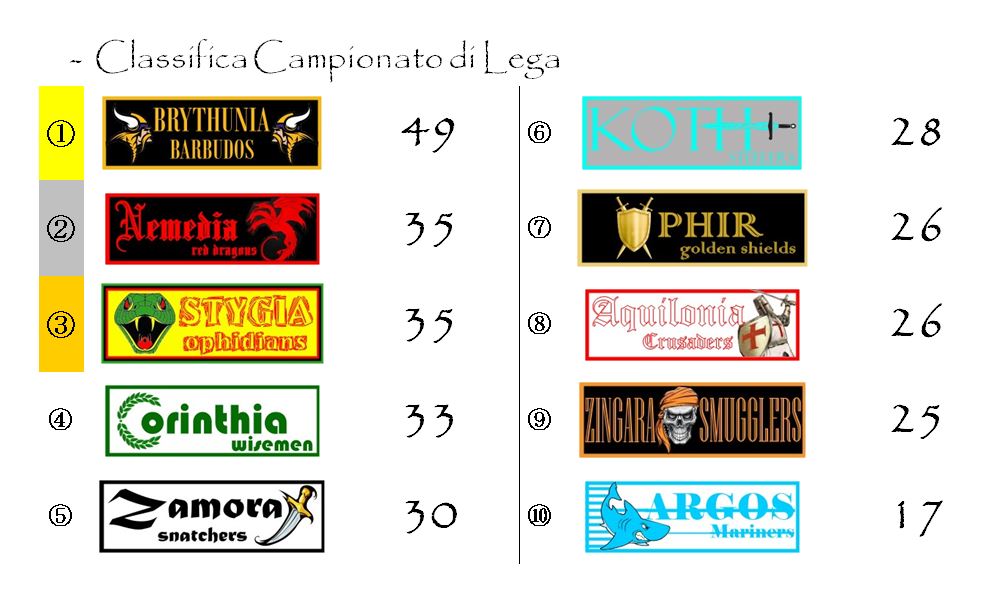 Il distacco che ha imposto a tutte le sue avversarie è tale che, ormai, Brythunia non ha più neanche bisogno di stare a guardare cosa accade sugli altri campi. E’ solo questione di tempo e di matetmatica. A maggio i giallo-neri avranno l’opportunità di entrere a far parte del ristretto club delle franchigie pluri-campionesse di Hyboria. Club di cui fanno parte, al momento, solo Aquilonia e Corinthia.