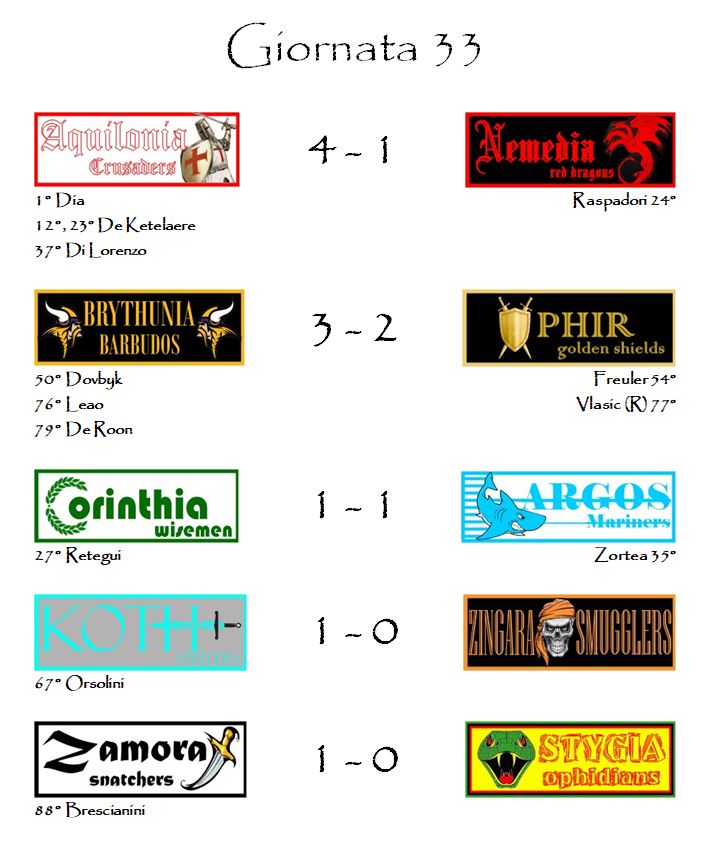 Per la seconda volta nella storia del nostro fantacalcio la trentatreesima giornata è risultata decisiva per l’assegnazione del titolo. Era accaduto anche tre anni fa, quando Ophir vinse con quattro giornate d’anticipo il suo primo ed unico Scudo d’Oro d’Hyboria battendo davanti al proprio pubblico la Brythunia. La storia si è ripetuta, ma al contrario.