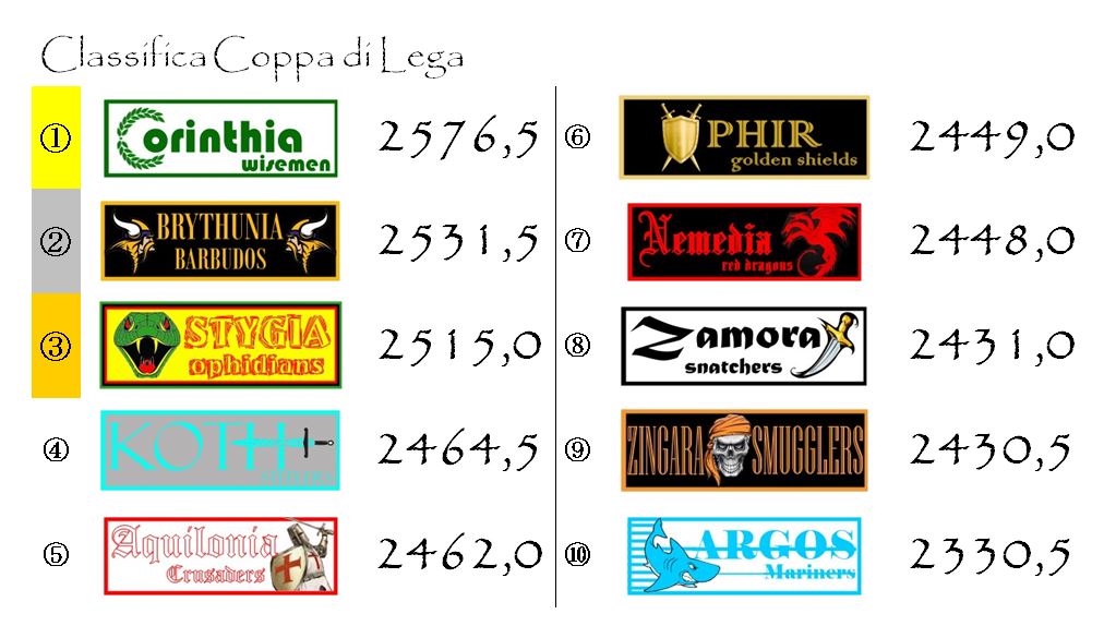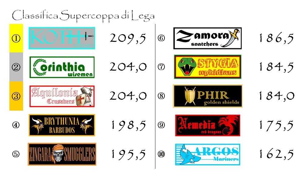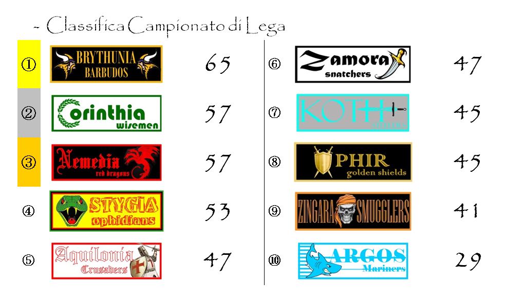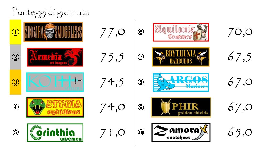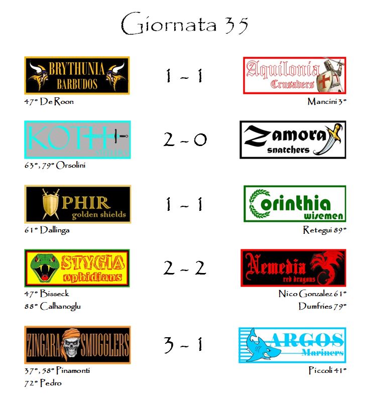 Il quadro degli incontri sarà completato da Aquilonia–Stygia, Zingara–Ophir ed Argos–Koth, tre partite che non muoveranno nulla in Campionato ma che per alcune di queste squadre sono fondamentali su altri versanti.