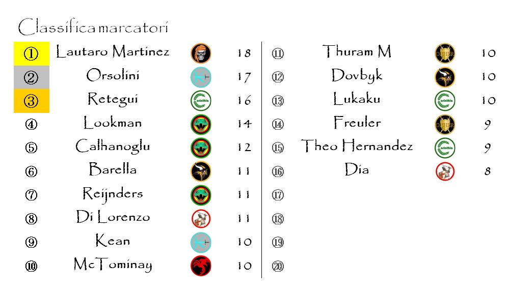 Il capitano di Koth ha messo a segno una rete molto importante ed è riuscito pure a beneficiare di una delle tre marcature extra attribuite in questo turno (le altre due sono andate a Martin De Roon ed Hakan Calhanoglu). Così facendo è arrivato ad una sola lunghezza di distanza da Lautaro Martinez, leader della classifica e detentore del titolo.