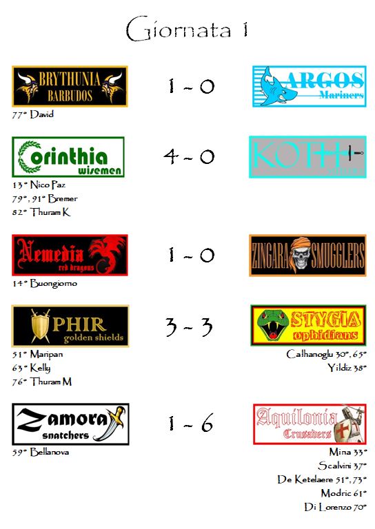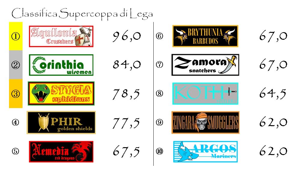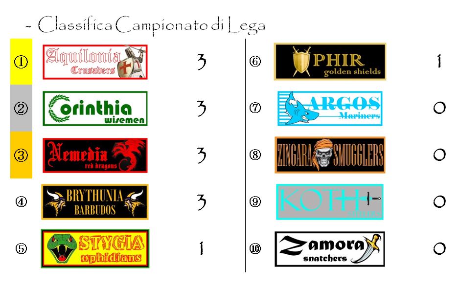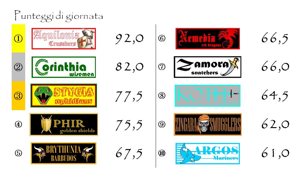 Con questo punteggio Aquilonia diventa di diritto la favorita per la vittoria delle Spade d’Oro di Hyboria. Qualcuno potrebbe anche sopravanzarla nelle prossime giornate, ma man mano che la graduatoria si stabilizzerà il suo ruolo di lepre apparirà sempre più chiaro.