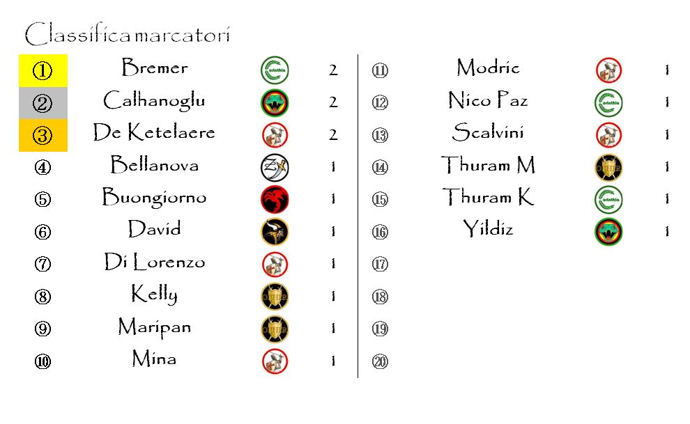 Alla guida della provvisoria classifica dei marcatori ci sono Charles De Ketelaere ed Hakan Calhanoglu, entrambi autori di una doppietta.
