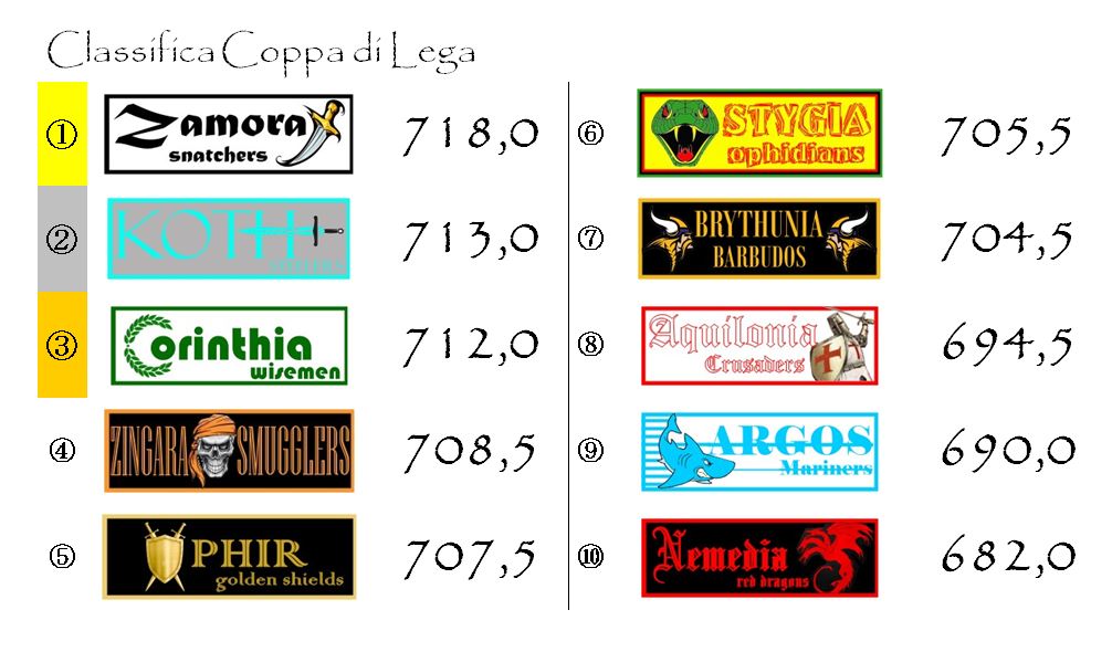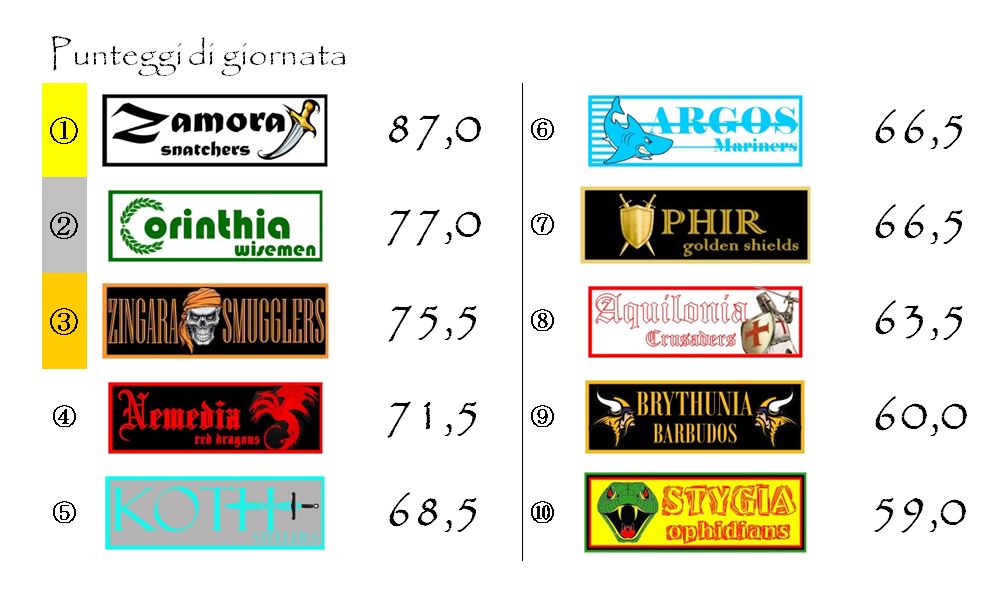 Gli Snatchers, mettendo a referto 87 punti, hanno notevolmente migliorato il valore complessivo del proprio punteggio, arrivando quasi ad agganciare un’Aquilonia che fino a pochi giorni fa sembrava irraggiungibile.