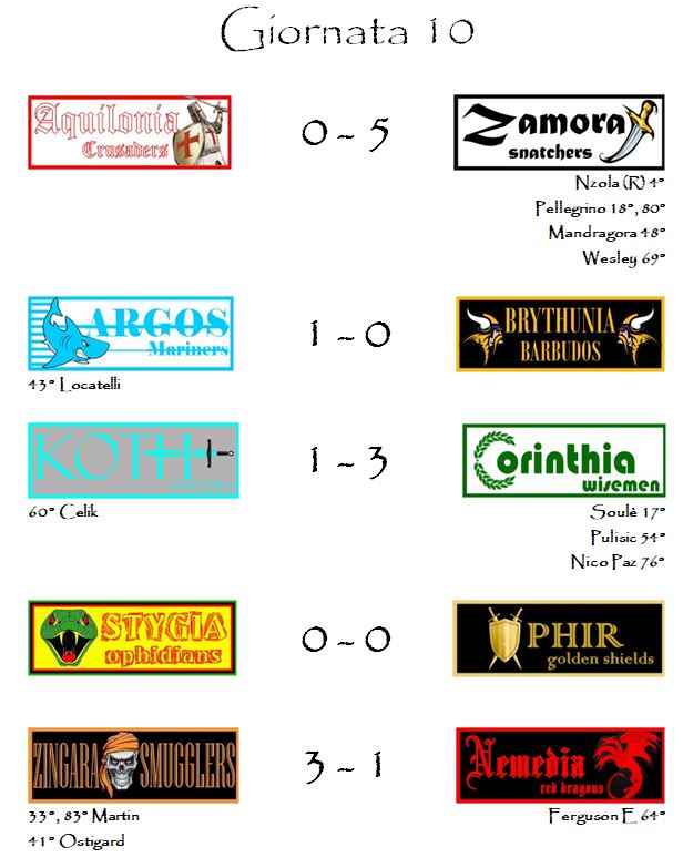 In testa alla classifica è tornata Zamora che, trionfante oltre ogni più rosea previsione sul campo di Aquilonia, ha acceso la freccia e salutato tutti.