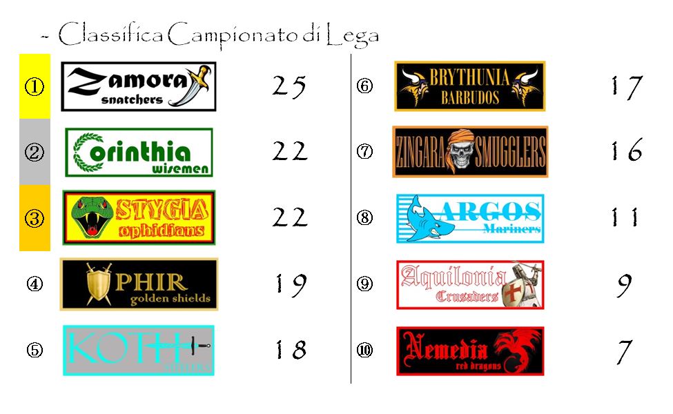 Una gara dal peso specifico importante sarà pure quella che, al Tempio di Seth, metterà di fronte Stygia Ophidians e Zingara Smugglers. I padroni di casa dovranno inventarsi qualcosa per ovviare alle assenze di Calhanoglu ed Acerbi. Vedremo cosa faranno.