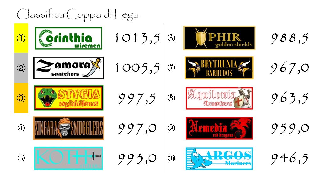 La graduatoria della Supercoppa di Lega è rimasta tale e quale a quella di una settimana fa.