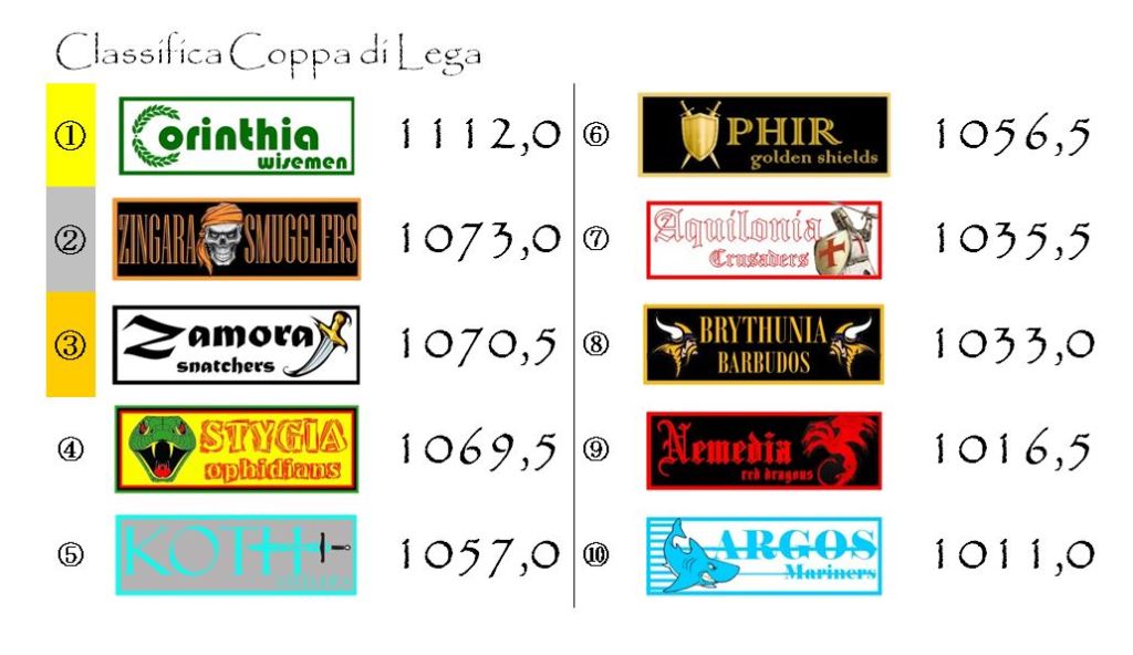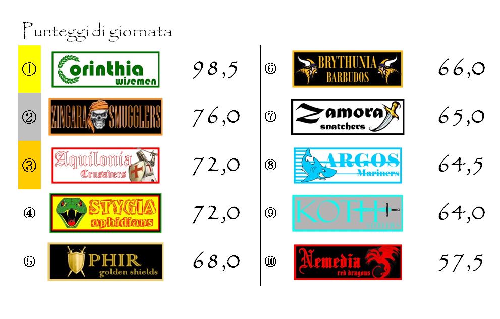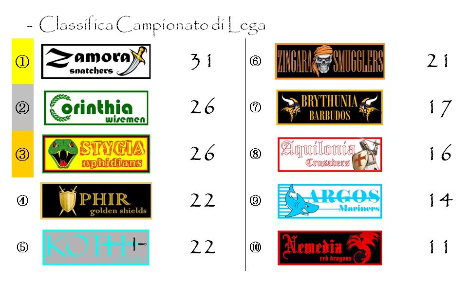 Zamora resiste strenuamente, un punto extra dopo l’altro. E a ruota segue pure Aquilonia che, sebbene sorpassata anche dai Wisemen, rimane ancora una valida pretendente al titolo grazie ad una difesa e ad un capitano che raramente steccano due partite consecutive.