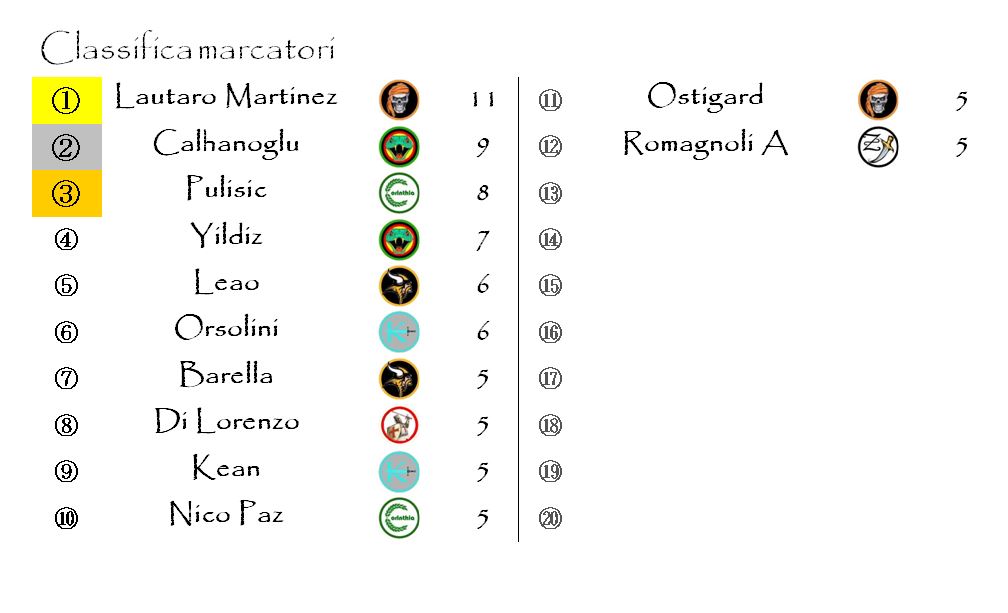 Le altre cinque marcature extra sono andate a Giovanni Di Lorenzo, Hakan Calhanoglu, Leo Osotigard, Guillermo Maripan e Adrian Ismajli.