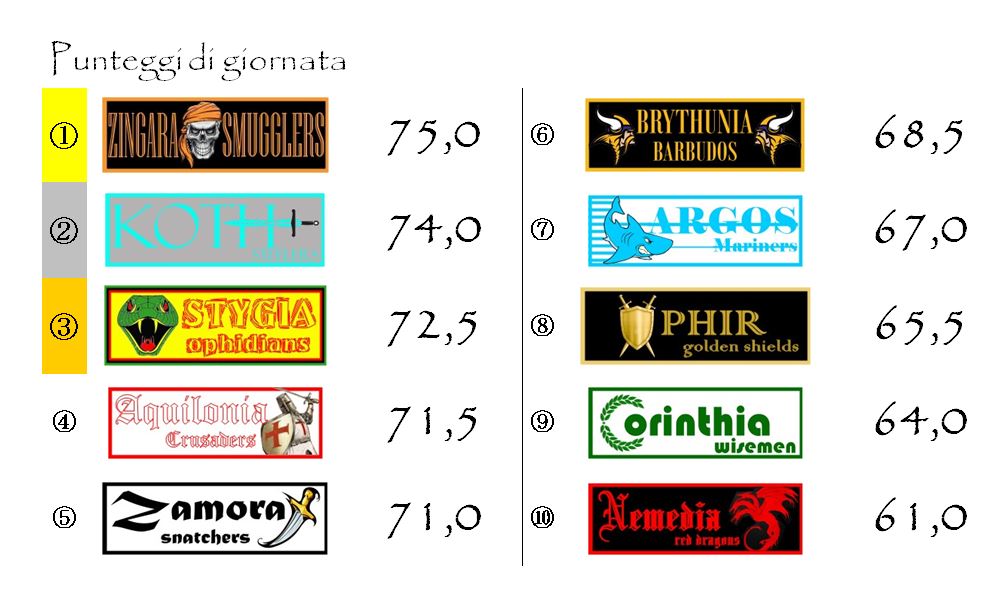 La penultima giornata del girone invernale sarà caratterizzata da ben due Derby: il più famoso, quello di Hyboria, tra Aquilonia e Nemedia, che si giocherà al Conan Memmorial di Tarantia; e quello dell’Est che vedrà la capolista Zamora ospitare al Maul Camp di Shadizar i campioni in carica di Brythunia in una gara che, per molti aspetti, risulta cruciale per entrambe le formazioni.