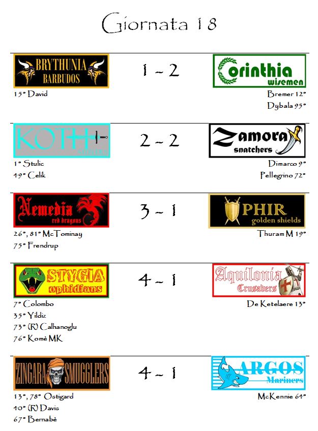 In questa diciottesima giornata di Supercoppa Zamora, Aquilonia e Corinthia hanno incassato due punti extra ciascuna. I distacchi sono, come potete immaginare, rimasti invariati. Le tre squadre in fuga continuano a marcarsi a uomo.