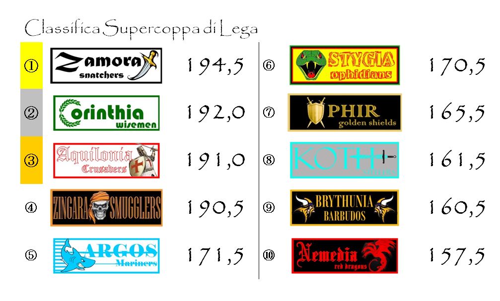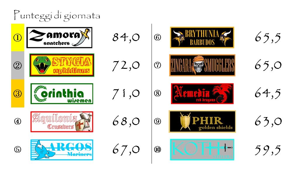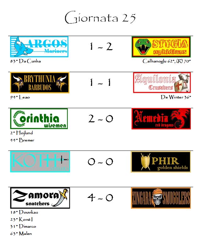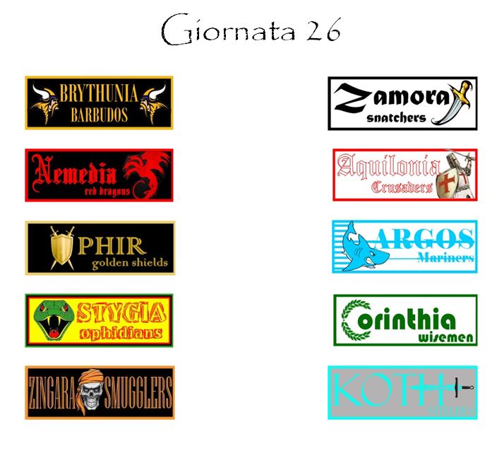 Ma non ci sarà da annoiarsi nemmeno con il trentacinquesimo Derby d’Hyboria della storia del nostro fantacalcio che si giocherà al Belverus Dome tra le arci-nemiche Nemedia ed Aquilonia né con un’Ophir–Argos che, anche valendo poco per la classifica, rimane sempre una grande classica della nostra lega.