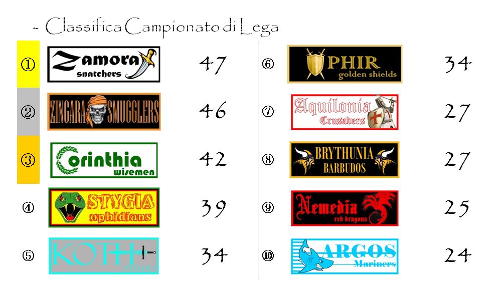 La corsa per lo Scudo d’Oro si dipanerà tra il Monumental di Pirogia, dove la neo-capolista Zamora sarà impegnata in un fondamentale derby contro i rivali, nonché campioni in carica, di Brythunia e l’Ocean Mancera di Kordava dove gli Zingara Smugglers di Enzo Bruno proveranno immediatamente a riscattarsi sfidando i Koth Steelers dell’ex Mattia Zaccagni.